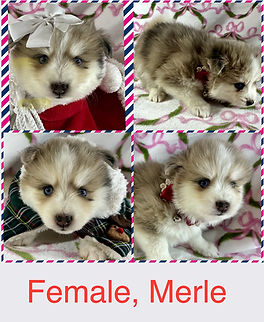Merle fur pattern, fluffy, with blue eyes - tracking 15-20pounds adult weight. Will turn 8 weeks on 18 December.